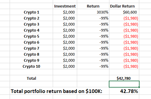 Now, let’s assume that every single one of her 10 altcoins, except one, loses 99% of value. We’re talking a near-complete loss of capital … -99% … on nine of 10 positions.